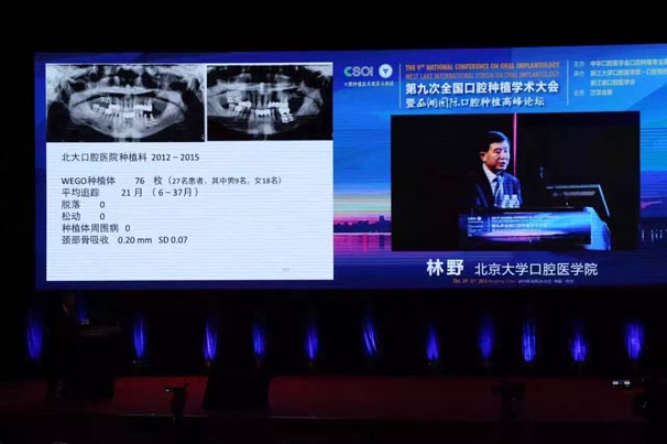 威高演講中林野教授對(duì)國(guó)產(chǎn)品牌WEGO牙種植體系統(tǒng)的設(shè)計(jì)和臨床表現(xiàn)表示肯定,向在座觀眾展示了WEGO牙種植體系統(tǒng)的臨床病例。病例對(duì)76枚WEGO牙種植體進(jìn)行了平均21個(gè)月的追蹤觀察,結(jié)果表明WEGO牙種植體脫落、松動(dòng)、種植體周?chē)‖F(xiàn)象均為0,頸部骨吸收平均值為0.20mmSD值0.07。